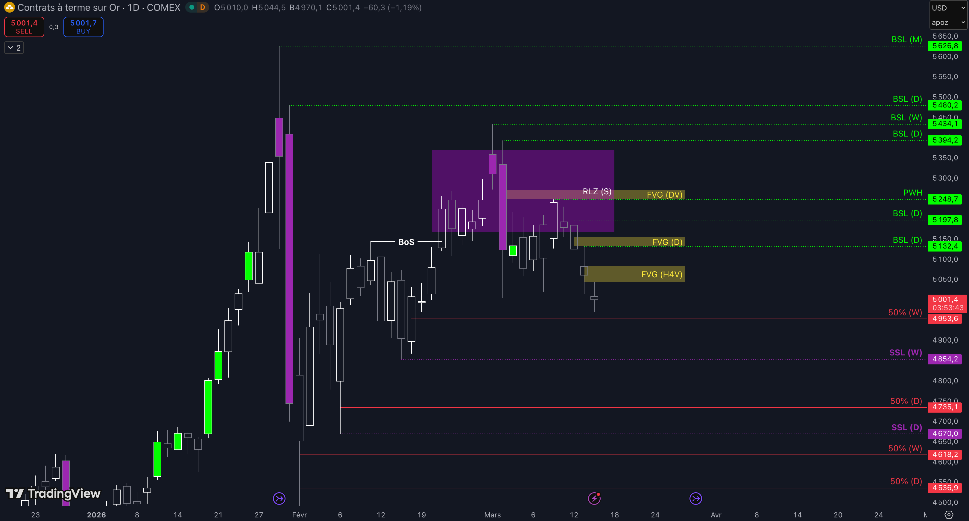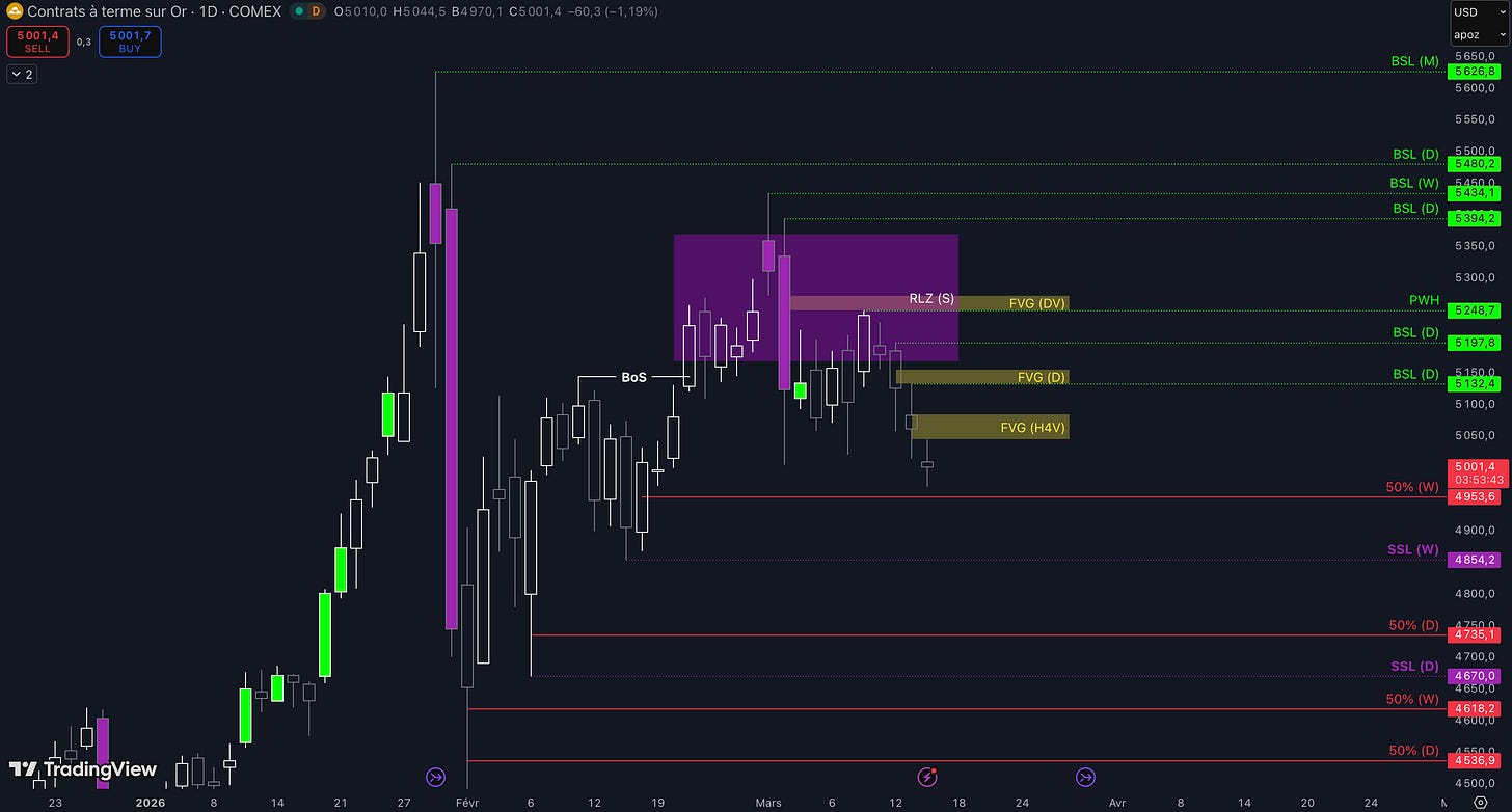 À noter : si les 2.783 $ sont cassés, il faudra nettement réduire sa position short swing mais sans la couper à 100 %, car un sommet descendant macro demeure probable et l’invalidation totale du short swing est une cassure weekly (BoS) à 3.403 $. J’ai expliqué les détails de cette stratégie sur YouTube ici.