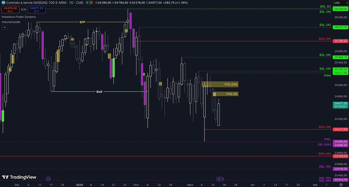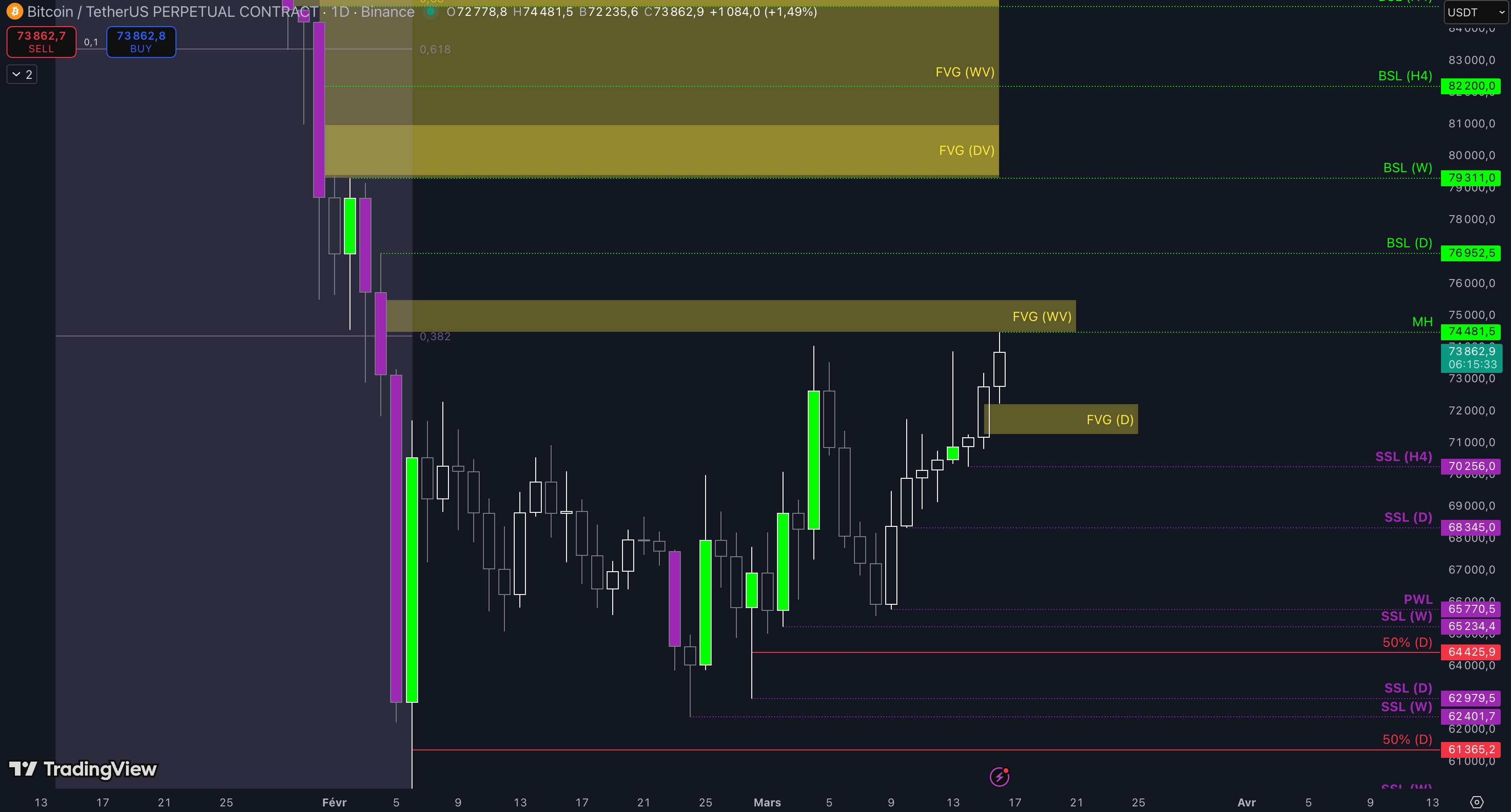 À noter : si les 75.465 $ sont cassés, il faudra réduire sa position short swing sans la couper à 100 %, car un sommet descendant macro demeure probable et l’invalidation totale du short swing est une cassure weekly (BoS) à 97.932 $. J’ai expliqué les détails de cette stratégie sur YouTube ici.