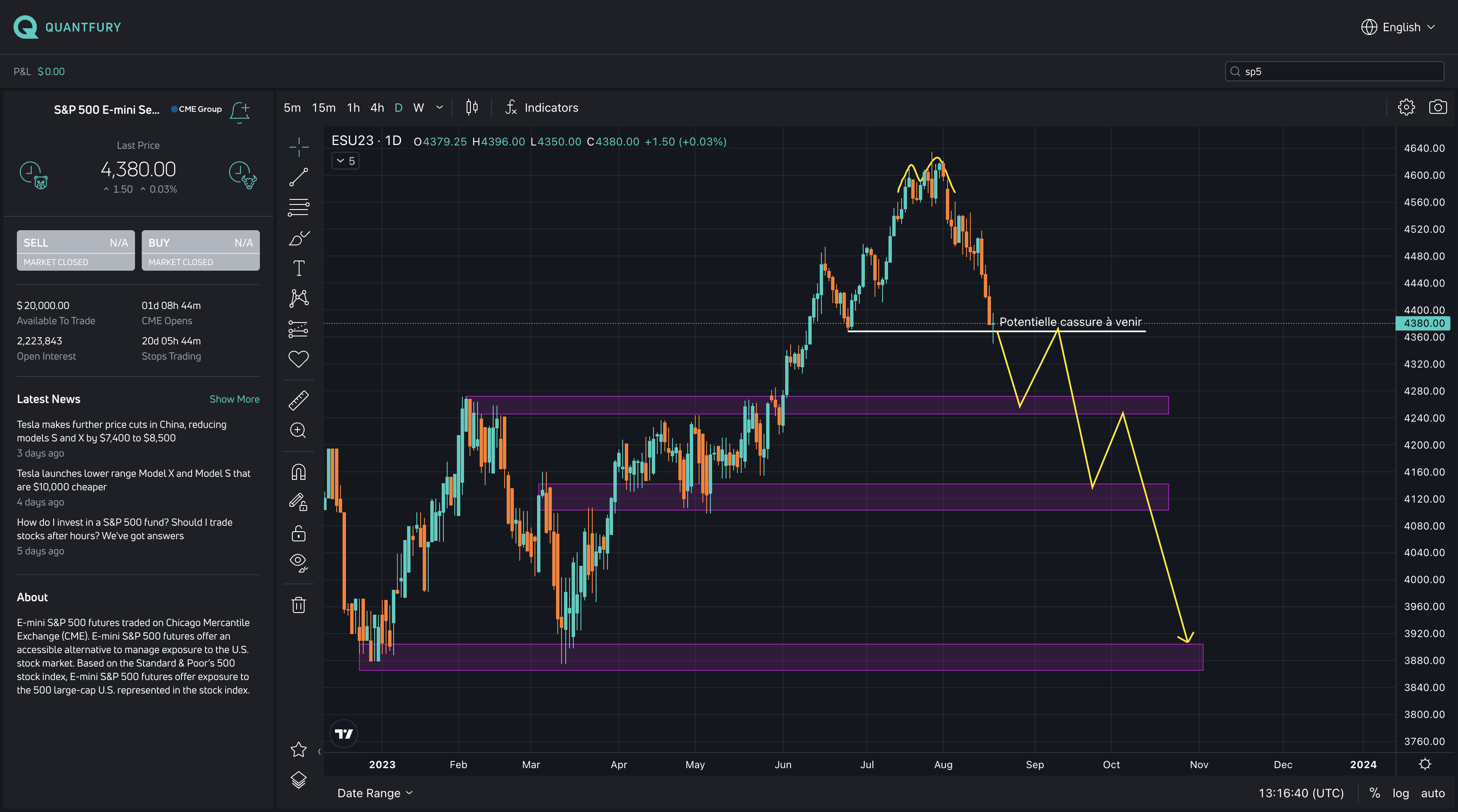 En cas de clĂŽture sous ce niveau, alors le S&P 500 entrera dans une dynamique baissiĂšre oĂč lâobjectif sera de shorter les sommets descendants.