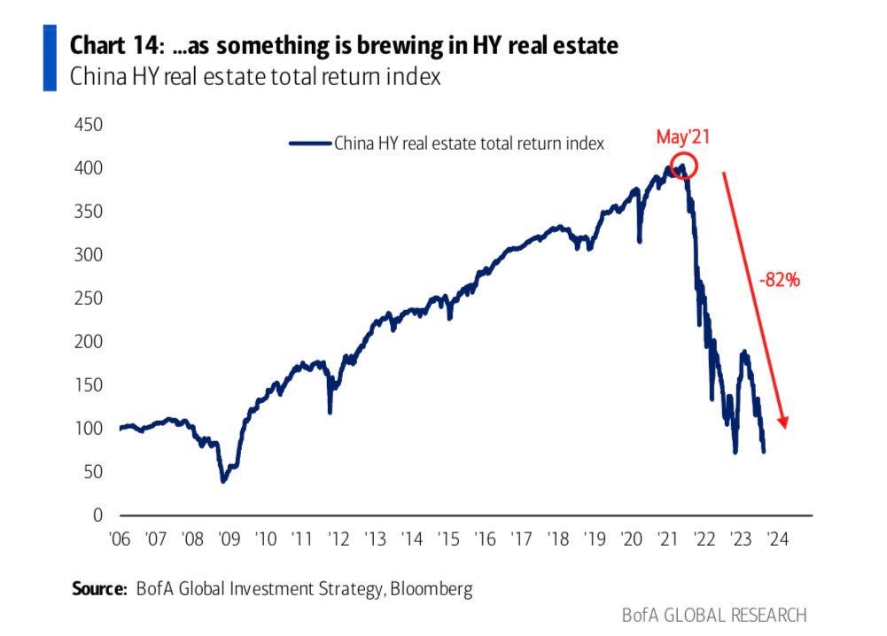 Le "China HY Real Estate Total Return Index" a perdu 82 % de sa valeur depuis son sommet en mai 2021 et menace dangereusement de casser le point bas de 2008 ce qui rendrait cette crise dévastatrice.