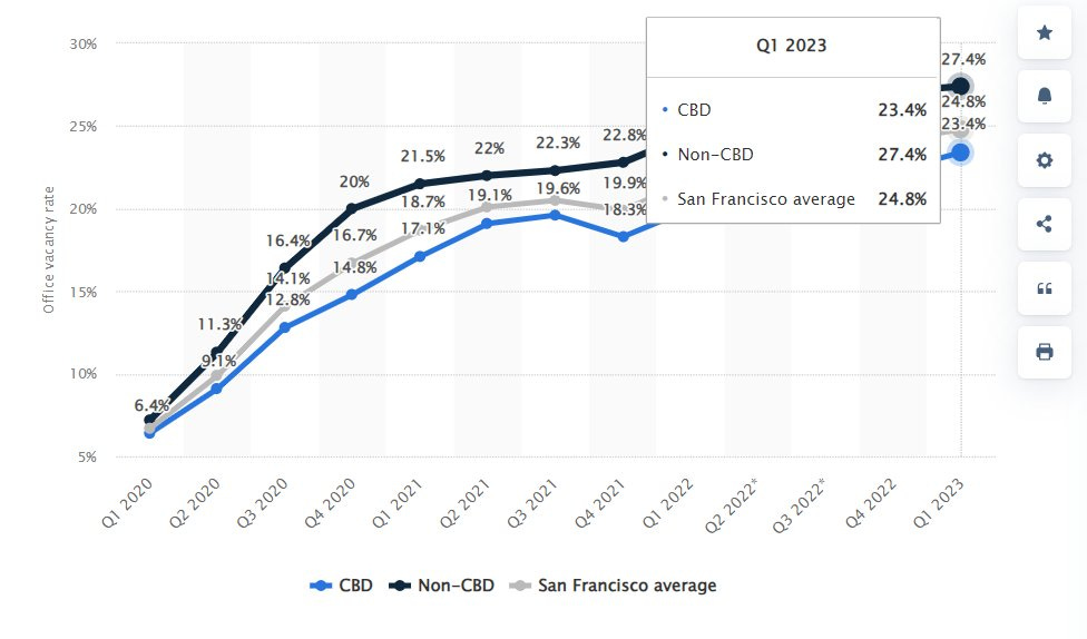 L'effondrement de l'immobilier commercial à San Francisco accélÚre parce que la ville est confrontée au ralentissement du secteur technologique, à la crise bancaire régionale et au taux d'inoccupation élevé des bureaux comme Salesforce ou Meta.