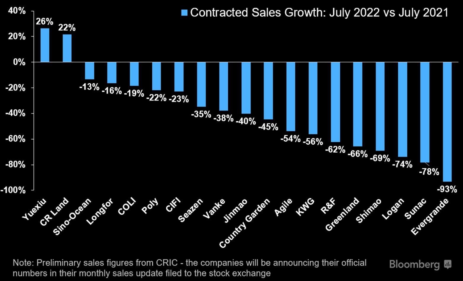 Les ventes des promoteurs immobiliers chinois ont chuté en moyenne de 39,7 % sur les derniers 12 mois donc pas de ventes = pas d'argent = pas de dettes remboursées...