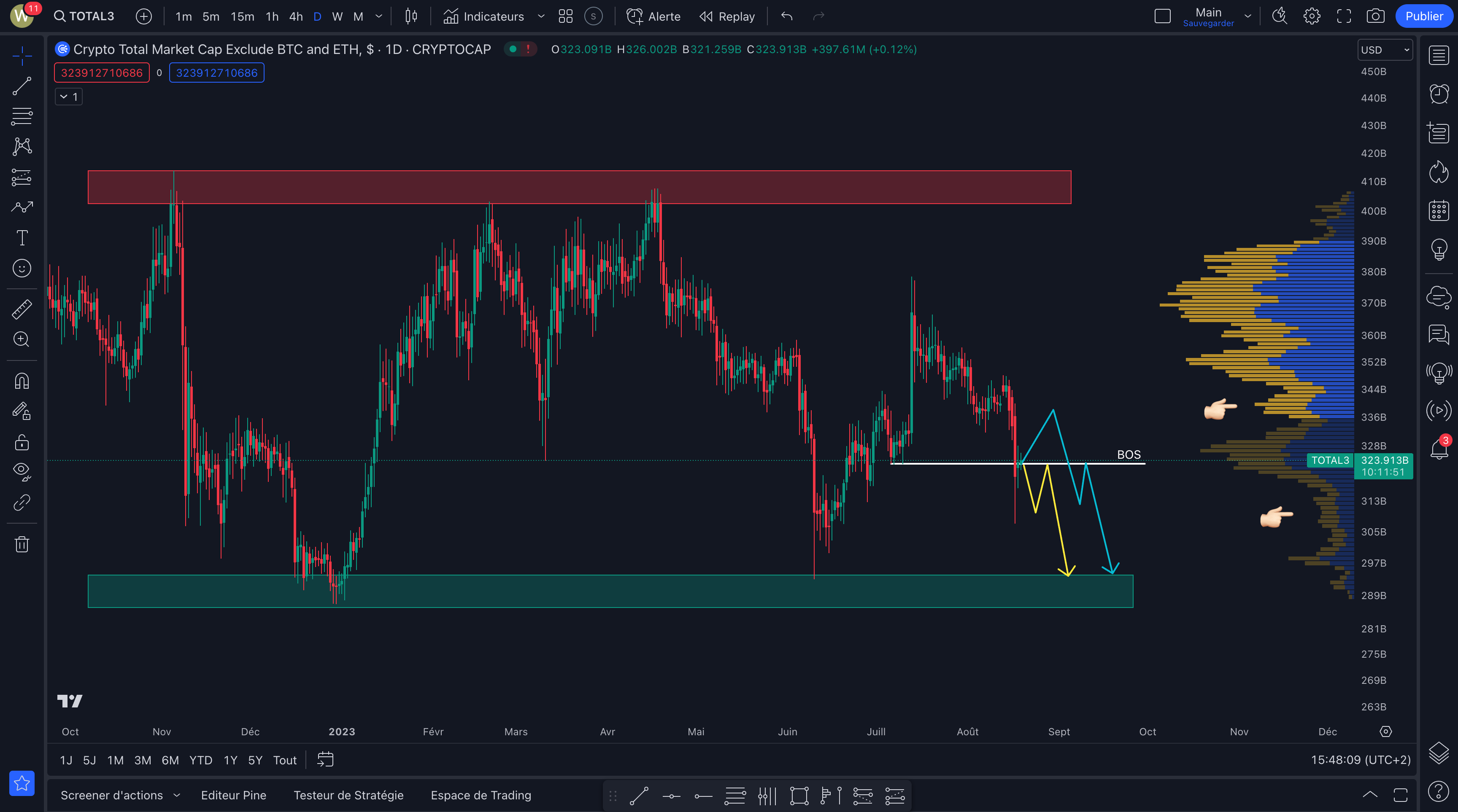 Le TOTAL 3, qui montre la capitalisation de marché des cryptomonnaies hors BTC et ETH, vient de casser le dernier creux imprimant ainsi une structure baissiÚre.