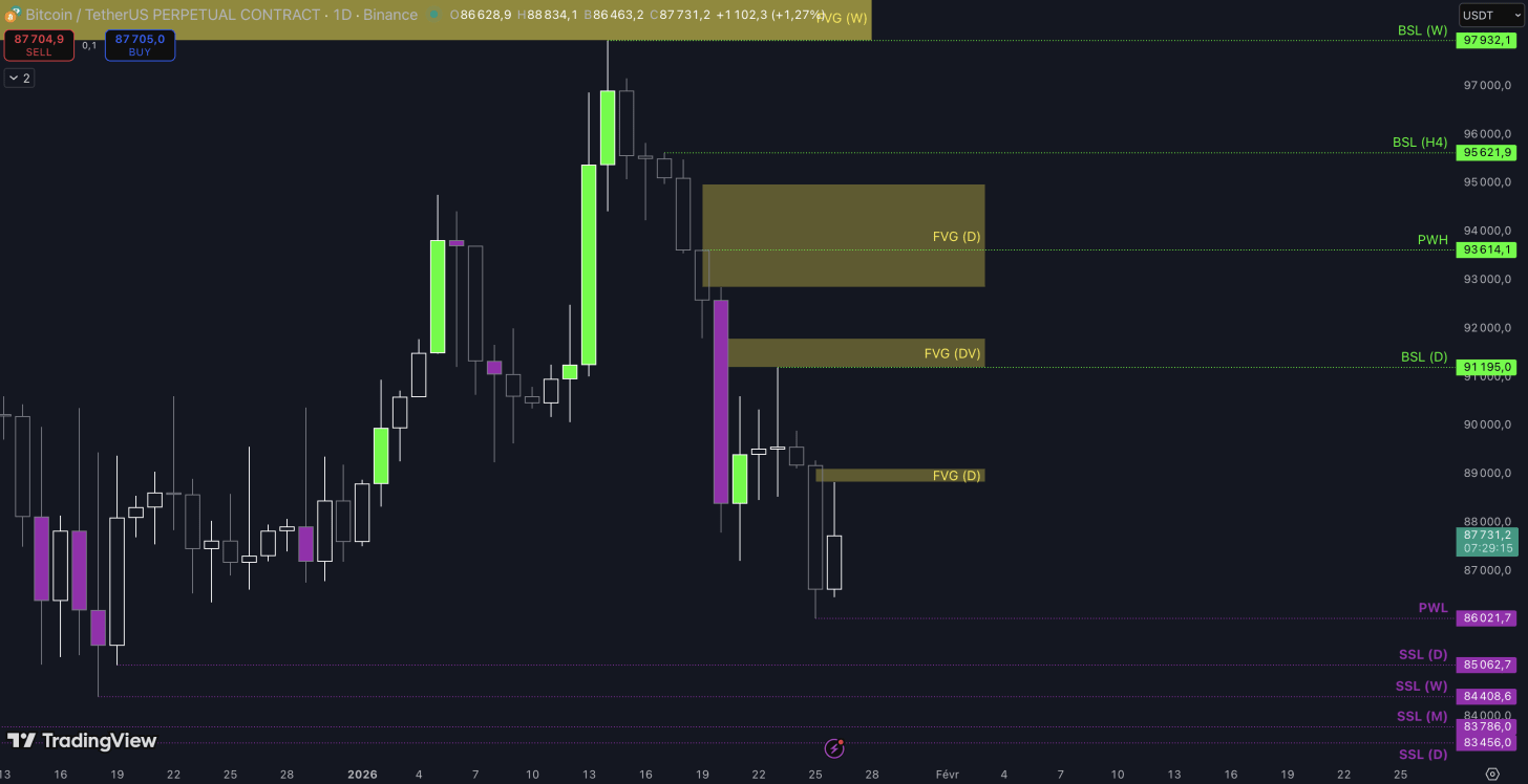 “Si le Fair Value Gap (FVG) est cassé par une clôture daily inférieure à 92.488 $ sans réintégration haussière du niveau ensuite, alors la dynamique deviendra baissière et les objectifs seront : le niveau à 90.066 $ (target N°1), puis, si aucun bottom ne se forme dans la zone précédente, alors le prochain objectif sera le niveau à 89.242 $ (target N°2), enfin, si toujours aucun bottom ne se forme dans la zone précédente, alors le prochain objectif sera la zone de liquidités entre 86.355 $ et 86.760 $ (target N°3)”.