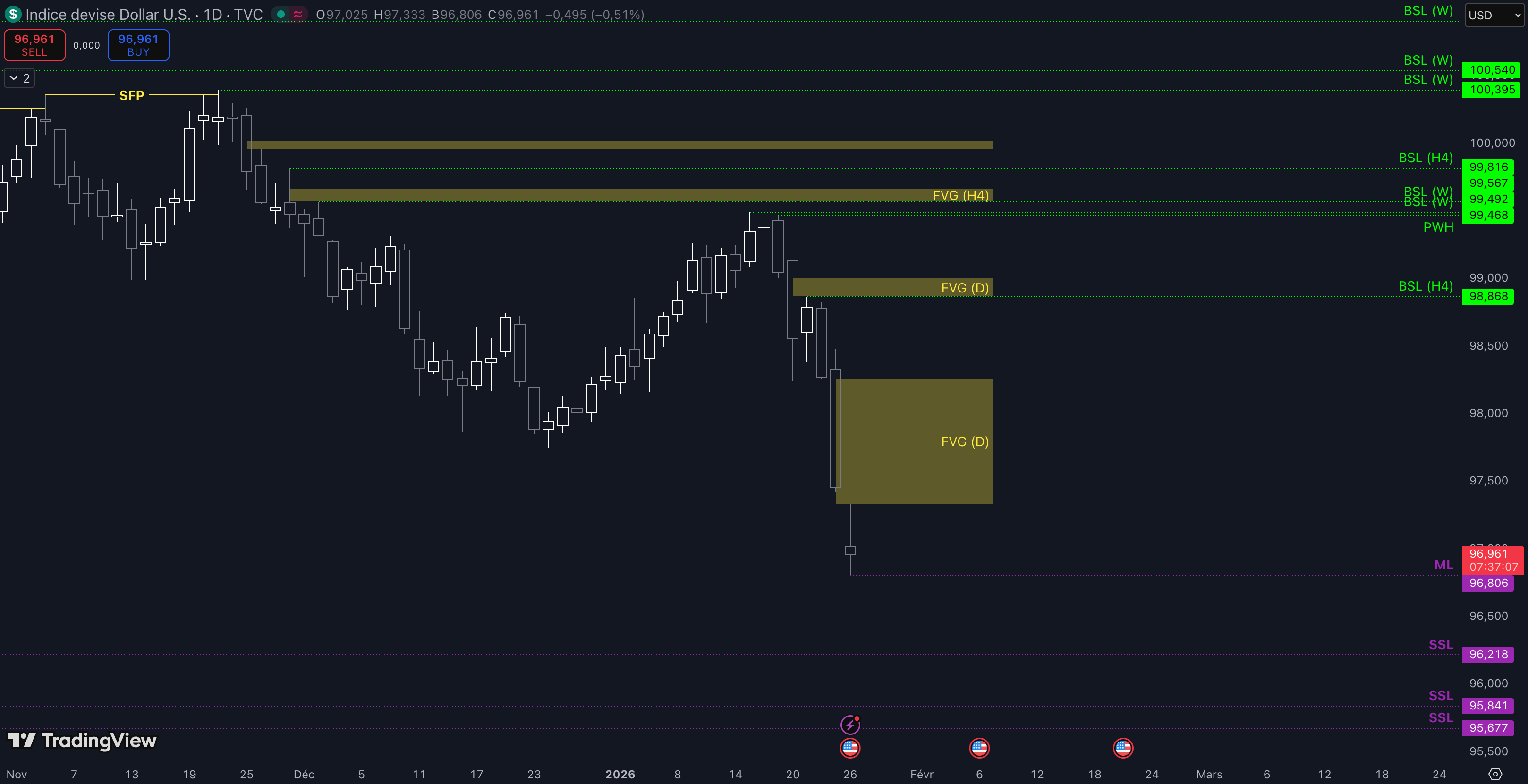 “Si le niveau à 98,49 $ est cassé par une clôture daily inférieure sans réintégration haussière du niveau ensuite, alors la dynamique deviendra baissière et les objectifs deviendront : les liquidités entre à 98,14 $ et 98,16 $ (target N°1), puis, si aucun bottom ne se forme dans la zone précédente, alors le prochain objectif sera le niveau à 97,91 $ (target N°2), enfin, si toujours aucun bottom ne se forme dans la zone précédente, alors le prochain objectif sera le niveau à 97,74 $ (target N°3)”.
