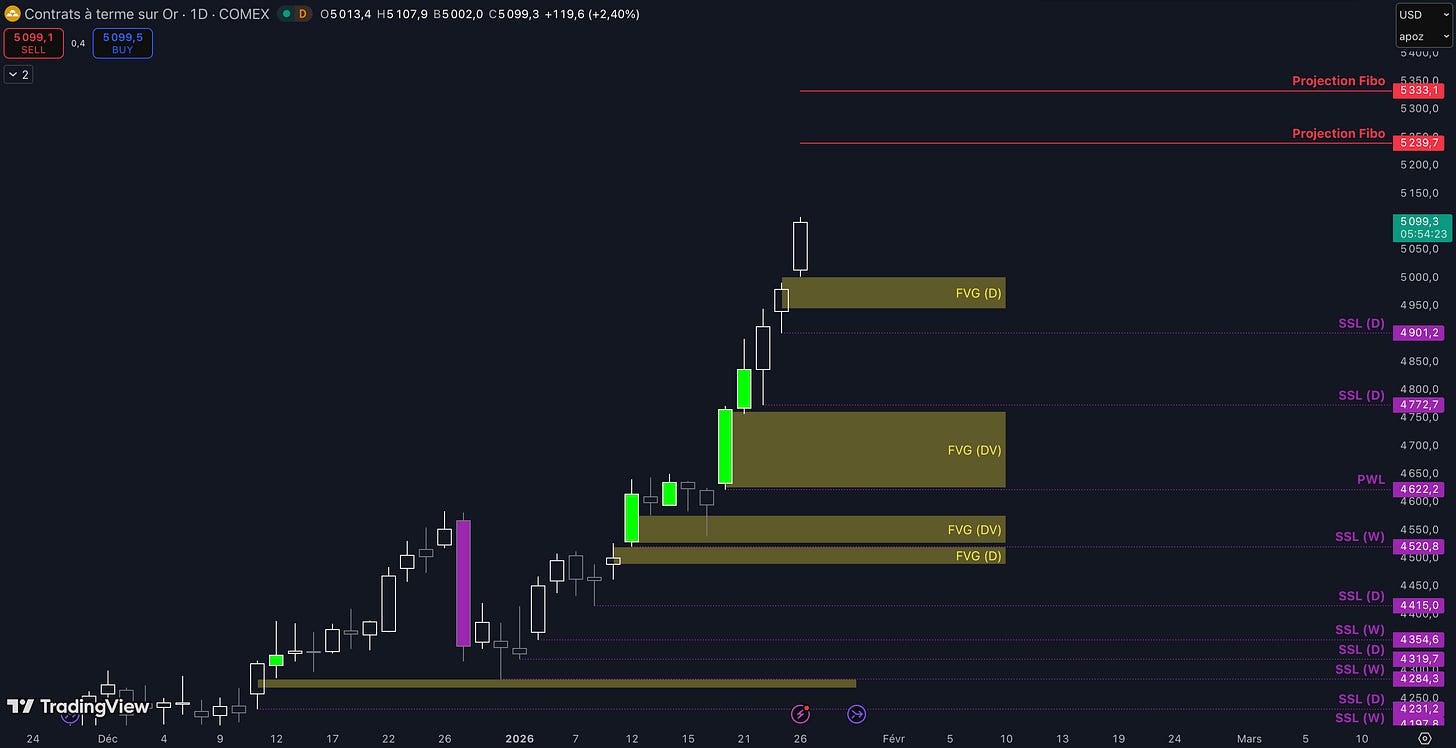 “Tant que le Fair Value Gap (FVG) entre 4.490 $ et 4.520 $ ne sera pas cassé, c’est-à-dire qu’aucune clôture daily inférieure n’est validée, alors la dynamique restera haussière et les objectifs seront : le niveau à 4.768 $ (target N°1), puis, si aucun top ne se forme dans la zone précédente, alors le prochain objectif sera le niveau à 4.883 $ (target N°2)”.