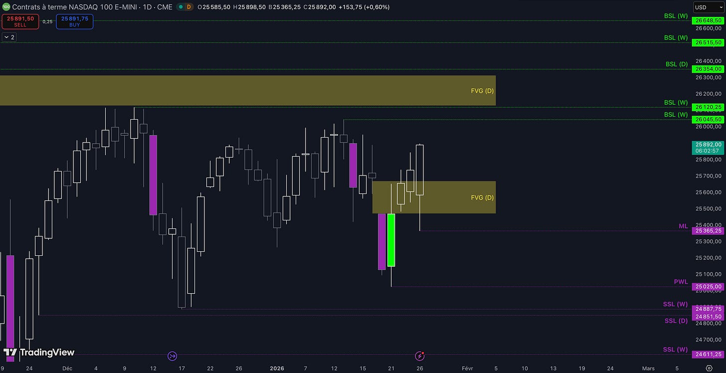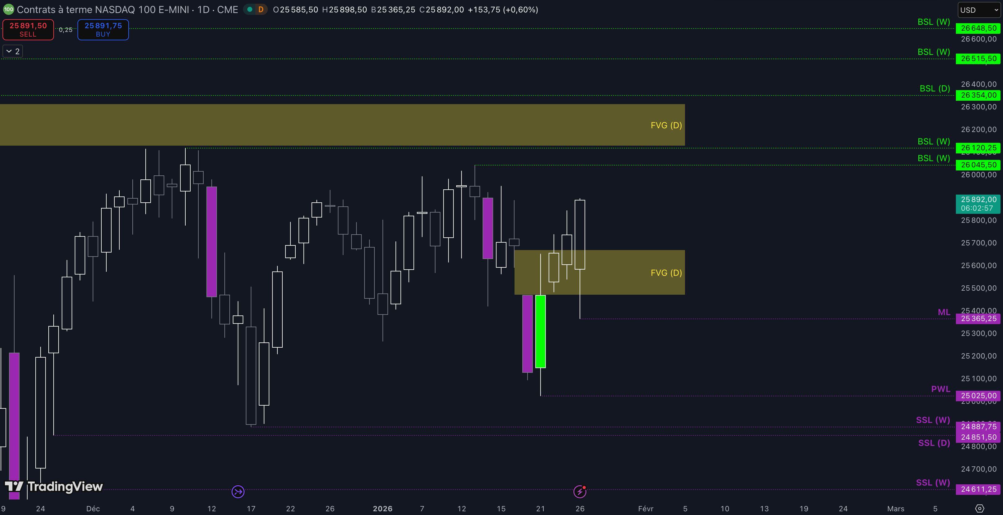 Les marchés financiers ont réagi fortement après que Trump ait annoncé des tarifs sur plusieurs pays européens, notamment en lien avec ses revendications sur le Groenland, ce qui a provoqué une forte chute des principaux indices américains (S&P 500, Nasdaq, Dow Jones) et accru la volatilité globale surtout sur le Dollar US qui continue de plonger face à l’euro depuis plus d’un an.