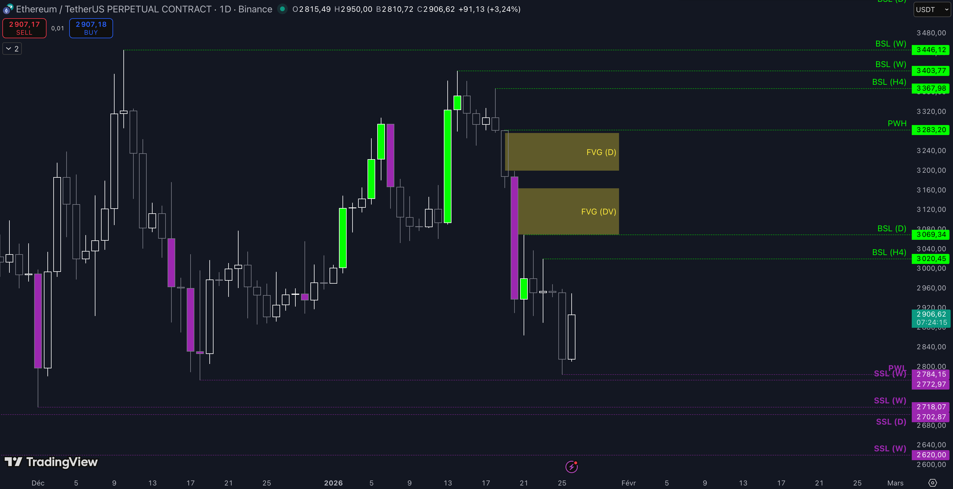 En revanche, si le Fair Value Gap (FVG) est cassé par une clôture daily inférieure à 4.944 $ sans réintégration haussière du niveau ensuite, alors la dynamique deviendra baissière à court terme et les objectifs seront :
