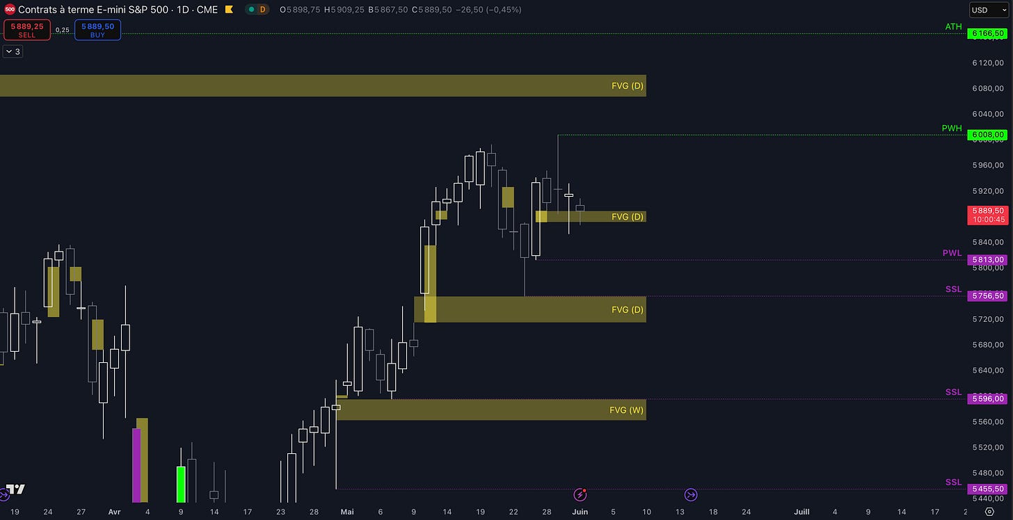 Tant que le Fair Value Gap (FVG) entre 5.889 $ et 5.872 $ est maintenu, c’est-à-dire qu’aucune clôture daily inférieure n’est validée, alors la dynamique restera haussière et les objectifs seront :