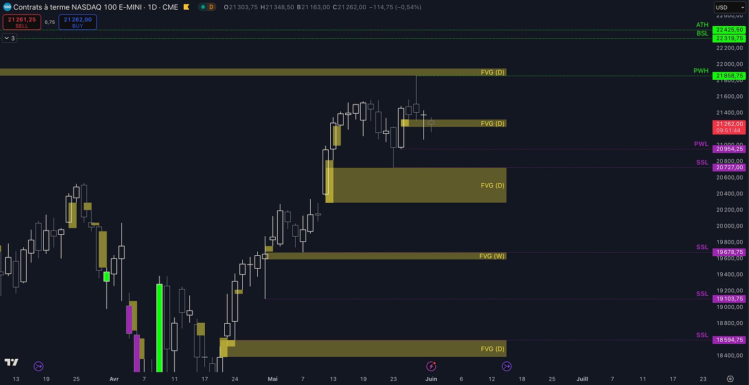 Tant que le Fair Value Gap (FVG) entre 21.318 $ et 21.227 $ est maintenu, c’est-à-dire qu’aucune clôture daily inférieure n’est validée, alors la dynamique restera haussière et les objectifs seront :