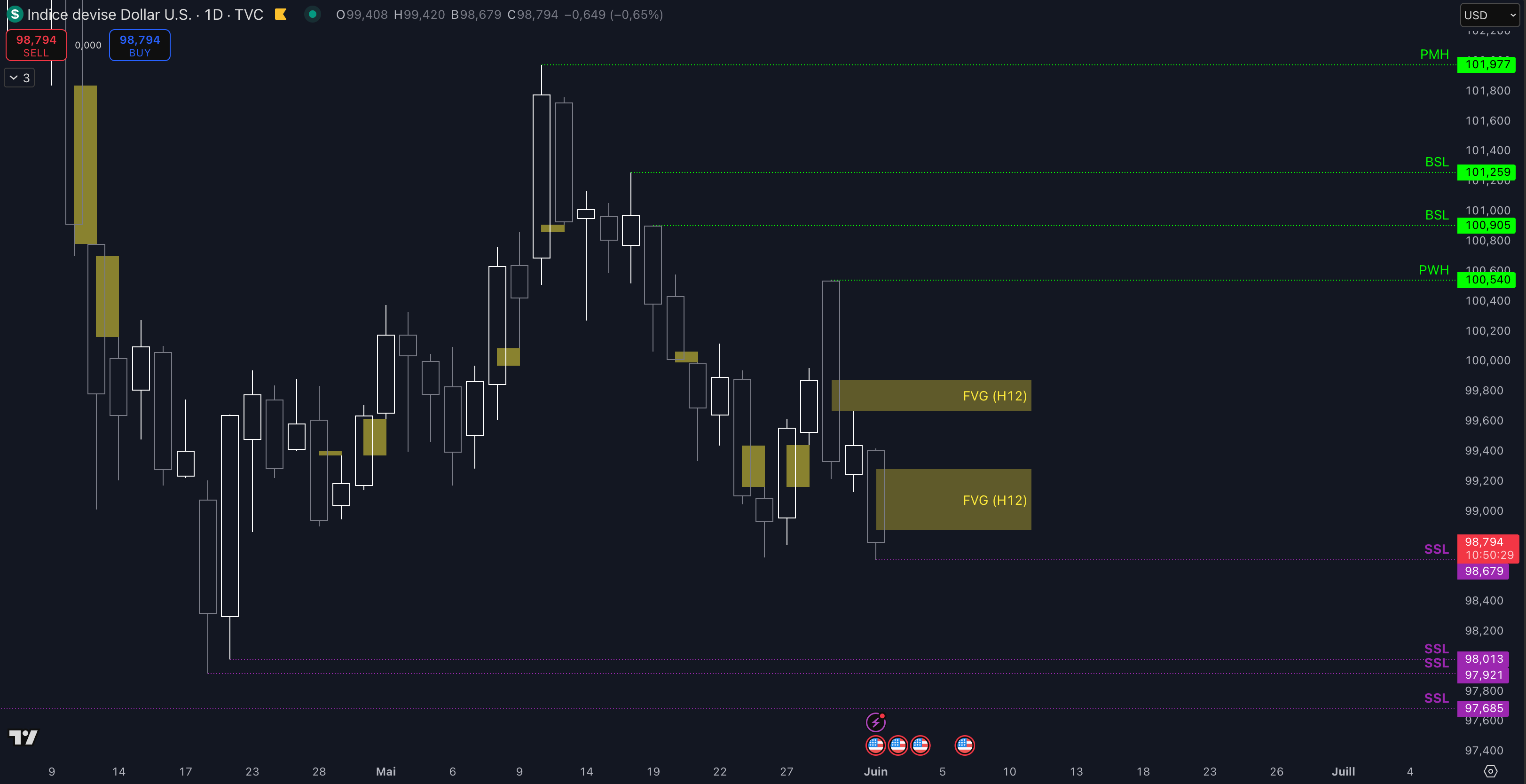 Tant que le Fair Value Gap (FVG) entre 99,28 $ et 98,87 $ n’est pas cassé, c’est-à-dire qu’aucune clôture daily supérieure n’est validée, alors la dynamique restera baissière et les objectifs seront :