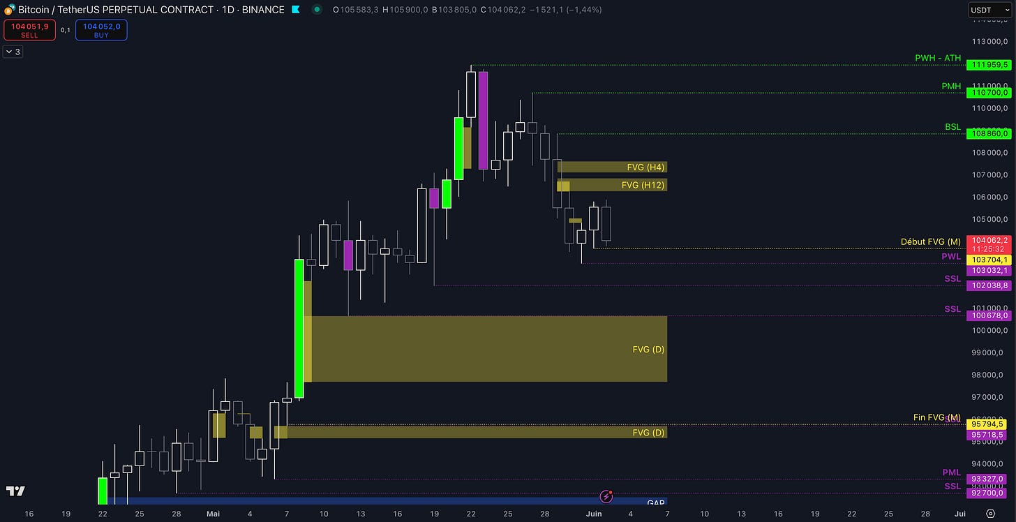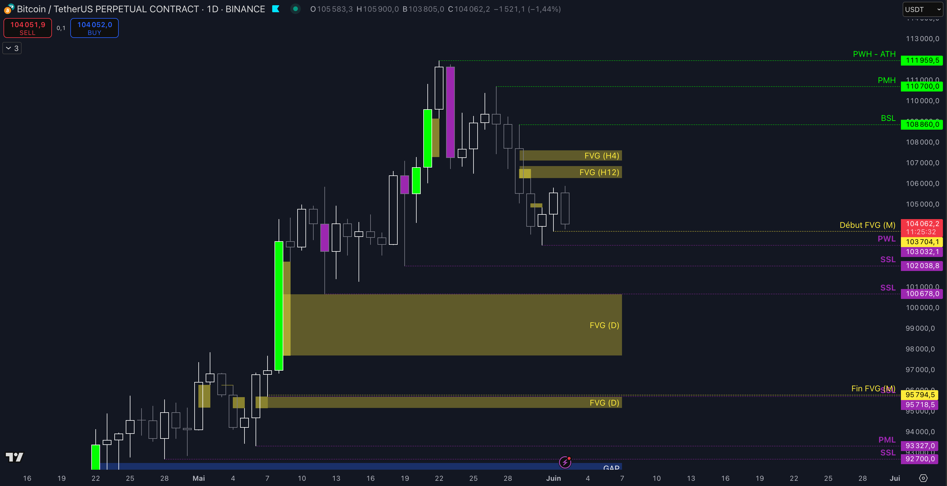 Tant que le Fair Value Gap (FVG) entre 106.266 $ et 106.862 $ n’est pas cassé, c’est-à-dire qu’aucune clôture daily supérieure n’est validée, alors la dynamique restera baissière et les objectifs seront :