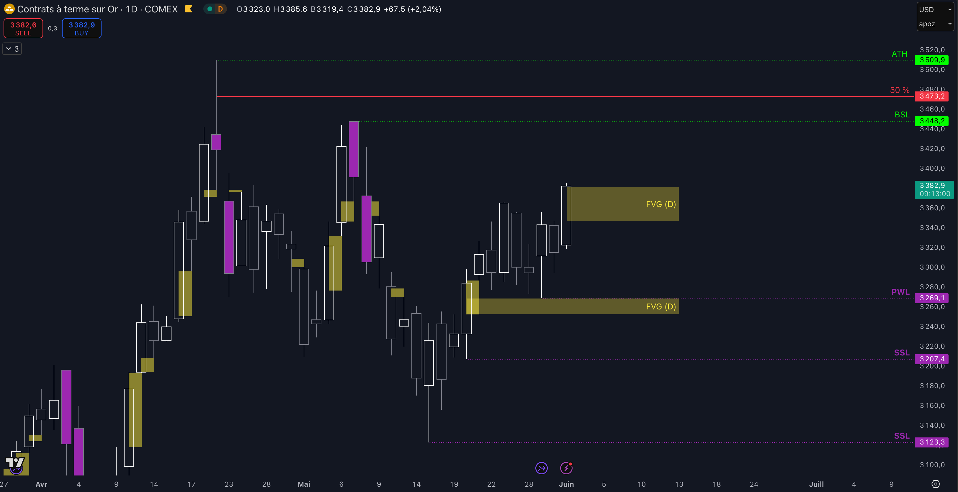 Tant que le Fair Value Gap (FVG) entre 3.347 $ et 3.381 $ est maintenu, c’est-à-dire qu’aucune clôture daily inférieure n’est validée, alors la dynamique restera haussière et les objectifs seront :