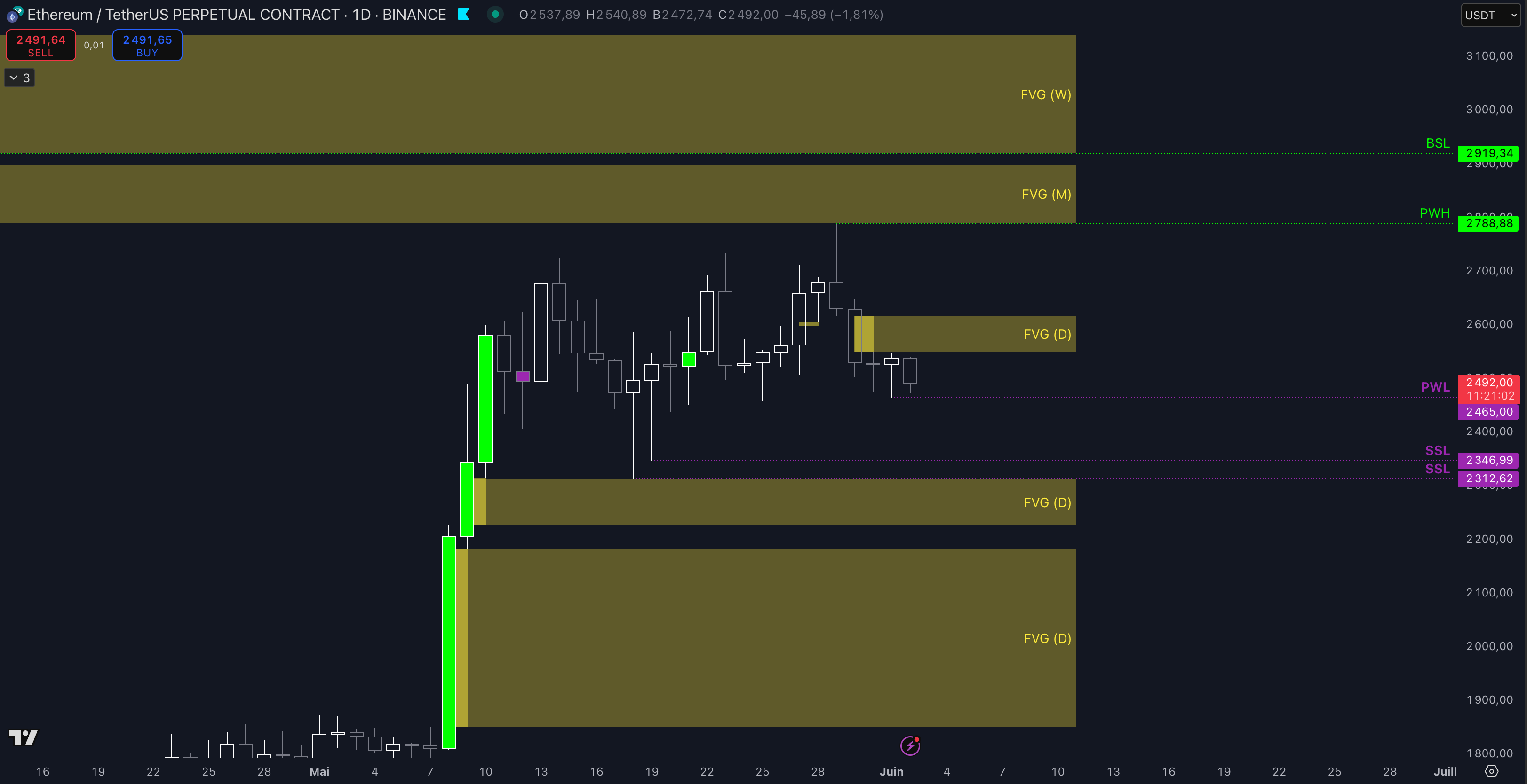 Tant que le Fair Value Gap (FVG) entre 2.550 $ et 2.615 $ n’est pas cassé, c’est-à-dire qu’aucune clôture daily supérieure n’est validée, alors la dynamique restera baissière et les objectifs seront :
