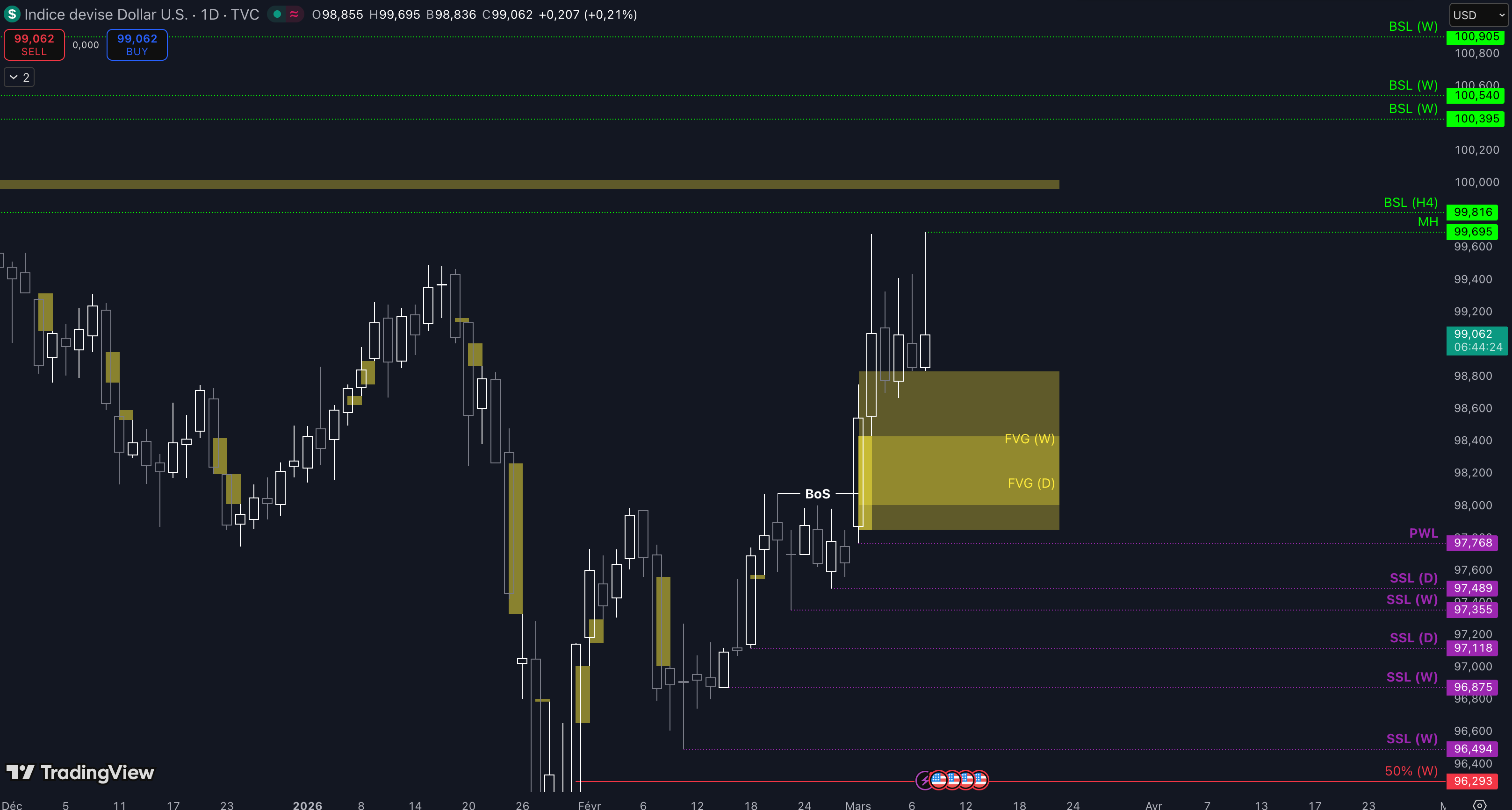 âTant que le niveau Ă 97,85 $ sera maintenu, câest-Ă -dire quâaucune clĂŽture daily infĂ©rieure nâest validĂ©e, alors la dynamique restera haussiĂšre Ă court terme et les objectifs seront : le niveau de liquiditĂ©s entre 99,46 $ et 99,56 $ (target N°1), puis, si aucun top ne se forme dans la zone prĂ©cĂ©dente, alors le prochain objectif sera le niveau Ă 99,81 $ (target N°2), enfin, si toujours aucun top ne se forme dans la zone prĂ©cĂ©dente, alors le prochain objectif sera le niveau Ă 100,39 $ (target N°3)â.