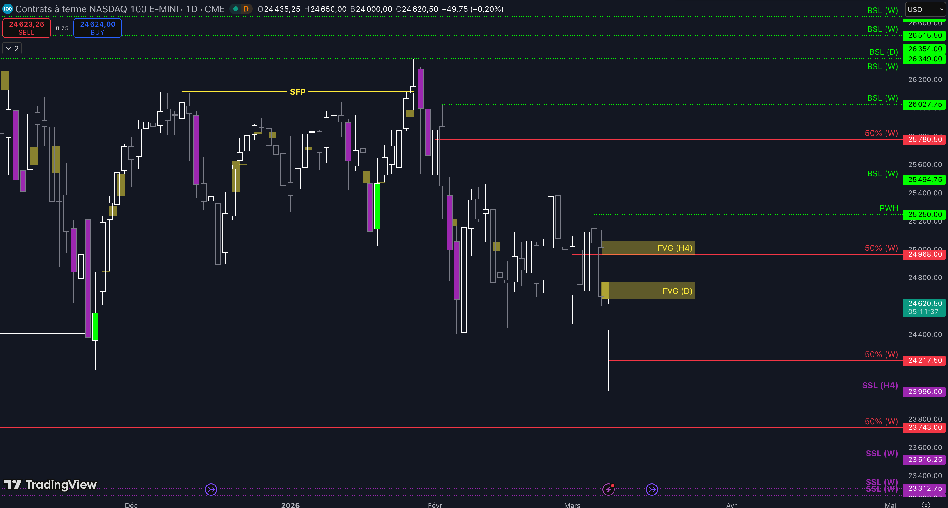 âTant que les 25.312 $ ne sont pas cassĂ©s, câest-Ă -dire quâaucune clĂŽture daily supĂ©rieure nâest validĂ©e, alors la dynamique restera baissiĂšre et les objectifs seront : le niveau Ă 24.668 $ (target N°1), puis, si aucun bottom ne se forme dans la zone prĂ©cĂ©dente, alors le prochain objectif sera le niveau de liquiditĂ©s entre 24.154 et 24.141 $ (target N°2), enfin, si toujours aucun bottom ne se forme dans la zone prĂ©cĂ©dente, alors le prochain objectif sera le niveau Ă 23.996 $ (target N°3)â.