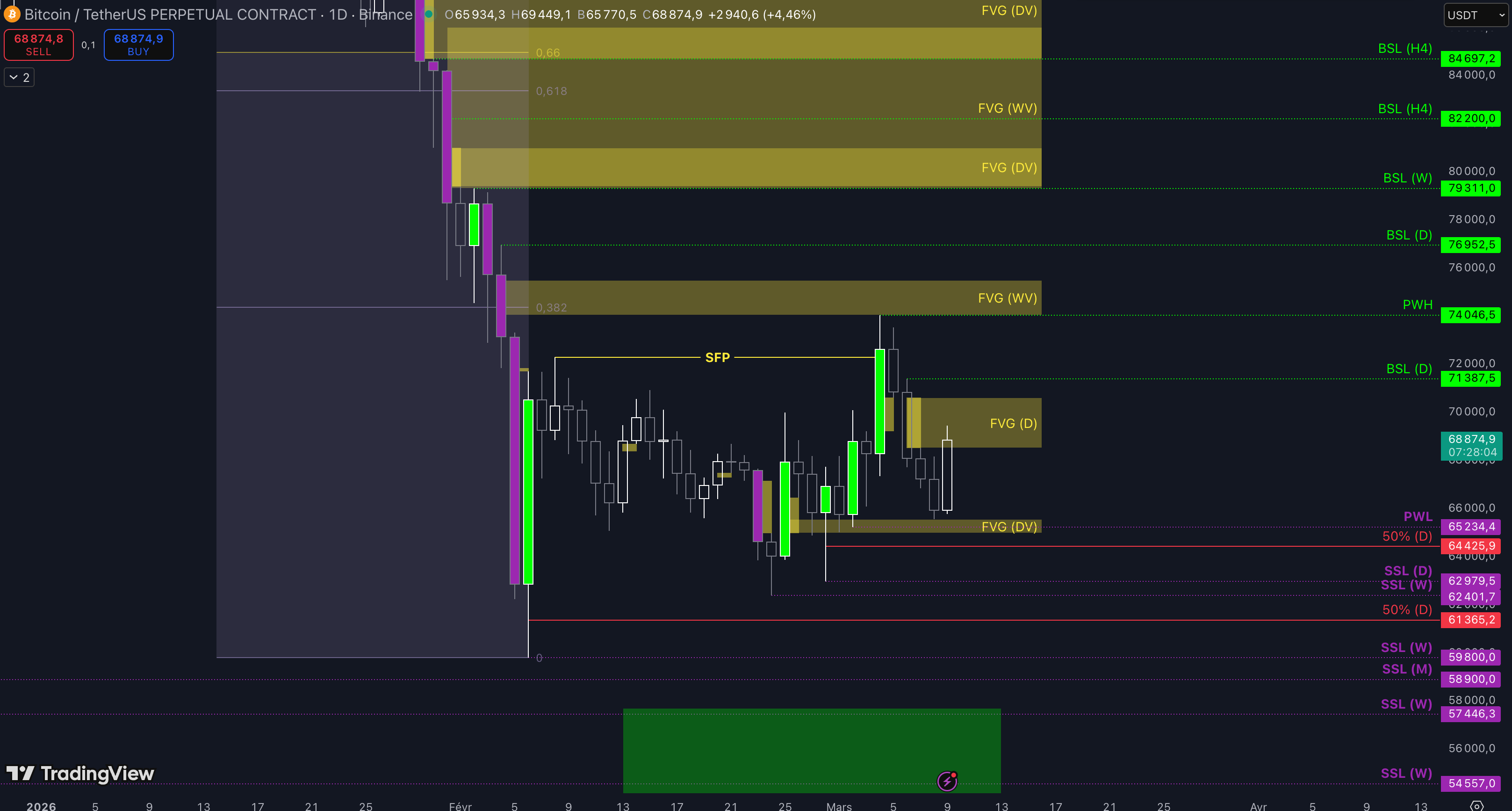 Ainsi, tant que le niveau Ă 70.619 $ nâest pas cassĂ©, câest-Ă -dire quâaucune clĂŽture daily supĂ©rieure nâest validĂ©e, alors la dynamique restera baissiĂšre et les objectifs seront :