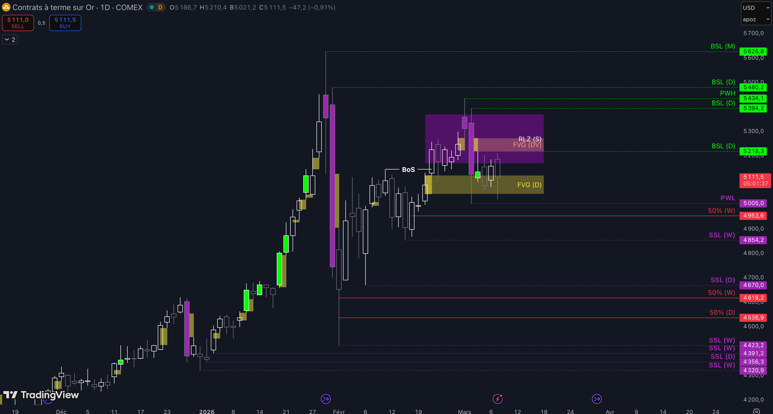 âTant que le niveau Ă 5.044 $ ne sera pas cassĂ©, câest-Ă -dire quâaucune clĂŽture daily infĂ©rieure nâest validĂ©e, alors la dynamique restera haussiĂšre Ă court terme et les objectifs seront : le niveau Ă 5.434 $ (target N°1), puis, si aucun top ne se forme dans la zone prĂ©cĂ©dente, alors le prochain objectif sera le niveau Ă 5.480 $ (target N°2)â.